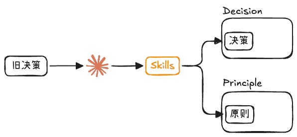 比如,你读完了一本《决策的艺术》,做了比较深入的笔记,也真正理解了书里的框架和方法。这个时候,你就可以把这些笔记丢给 Claude,让它帮你审视:这些内容能不能用来升级我们前面生成的「决策流程 Skill」,把它优化成书中更系统的决策框架。